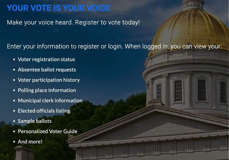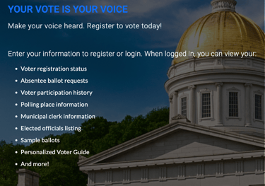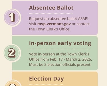 • Request an absentee ballot at https://vote.vermont.gov or contact the Town Clerk's Office.