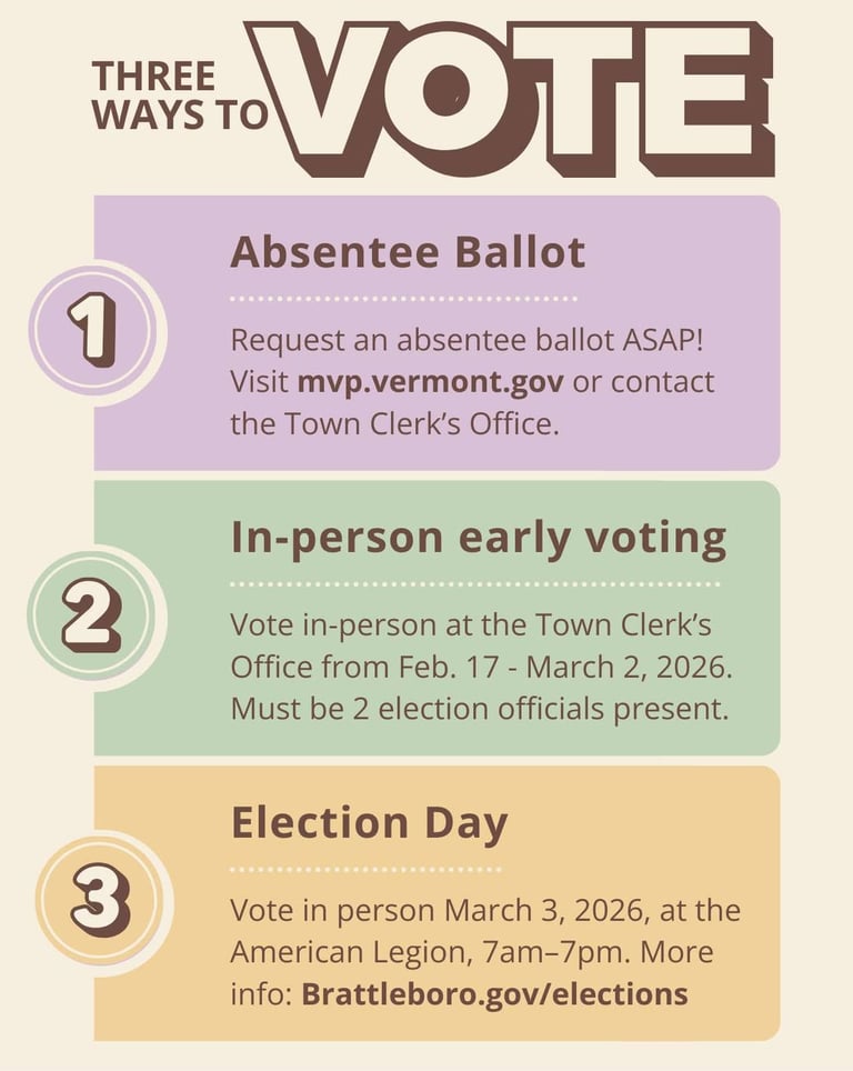 Get ready to vote! There are three major ways that Brattleboro voters can cast a vote in the upcoming Brattleboro Town Meeting and WSESD School Board elections.